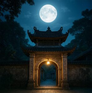 Gió về lao xao như lời kinh xưa ai tụng giữa trời thu. Trăng chưa lên cao mà sân đã sáng, dòng ánh sáng im lặng cổ kính. Mái chùa nghiêng nghiêng vươn níu mấy tầng mây bạc, chiếc chuông đồng treo lặng, chưa ai khẽ chạm tay mà âm thanh đã ngân tan trong lòng người. Cả vườn sen sau hè như ngừng thở, vì biết rằng đêm nay sẽ là đêm rằm của mùa trăng đẹp nhất trong năm.